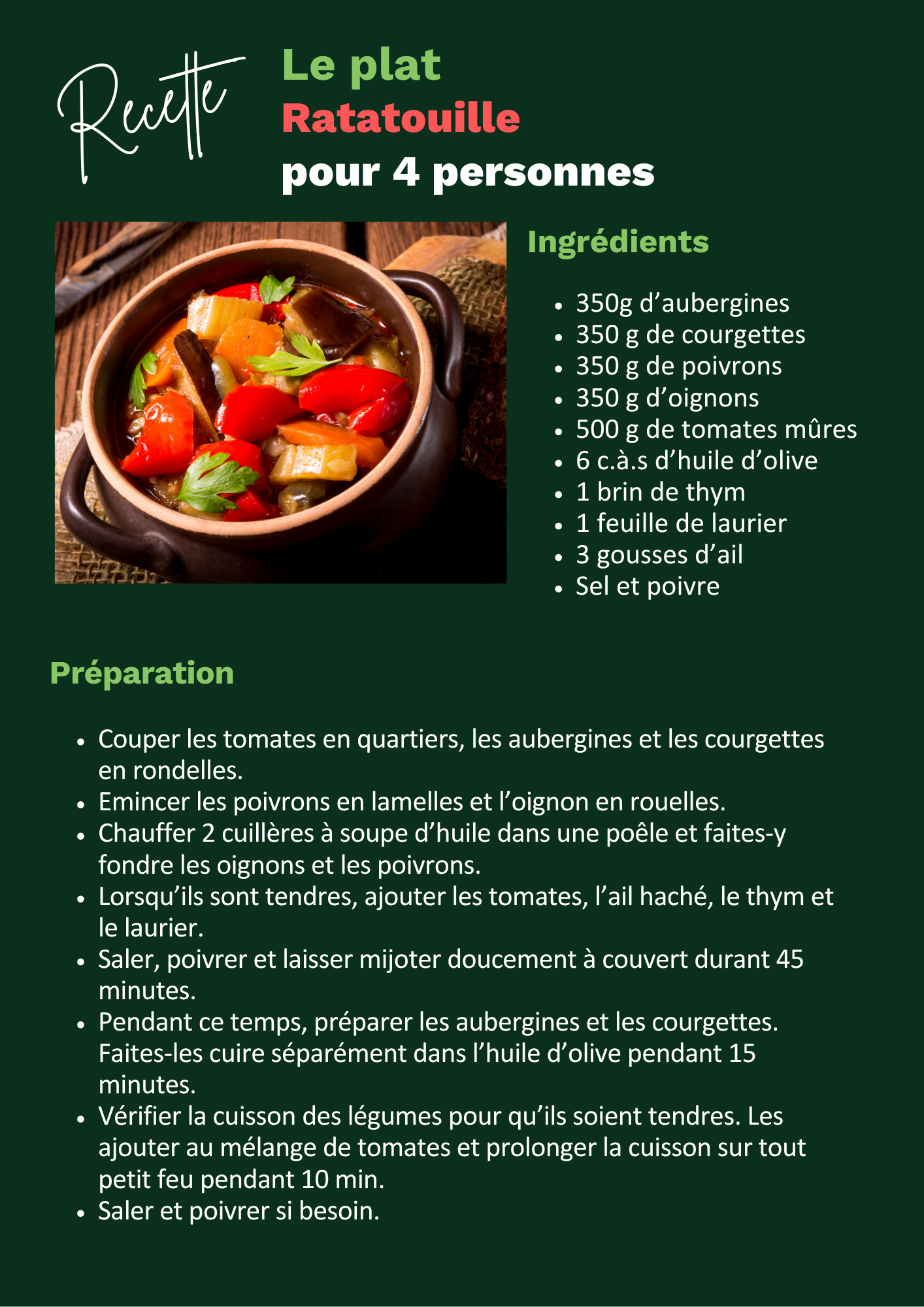 - Ratatouille (800g aubergines, 1kg courgettes, 1kg tomates, 300g oignons, 4 poivrons)