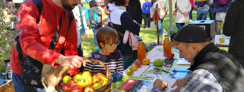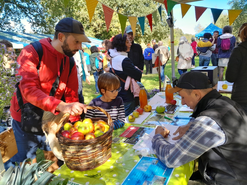 C’était une belle Fête du Verger ce dimanche 5 octobre 2025 à Hennebont avec toutes sortes d’animations, dont un spectacle avec les arbres pour décor et des sculptures sonores auxquelles petits et grands se sont essayés avec joie. Il y avait aussi une course de tracteur à pédales, une visite du verger, un blind test et plein de jeux. Au juste poids, c’est Aurélie qui remporte le panier avec une estimation tres proche (7,60 kg pour un poids reel de 7,59kg). La plus longue épluchure mesure 1,93 m Fatima Belamanya, de Resohabitat, qui tient à préciser qu’elle est porteuse d’un handicap. Félicitations à elles et merci à toutes les personnes venues faire de cette journée un moment très spécial, les bénévoles bien sûr mais aussi le public. Un coup de chapeau à Lise, du Service animation pour l’organisation. Récap en vidéo !
