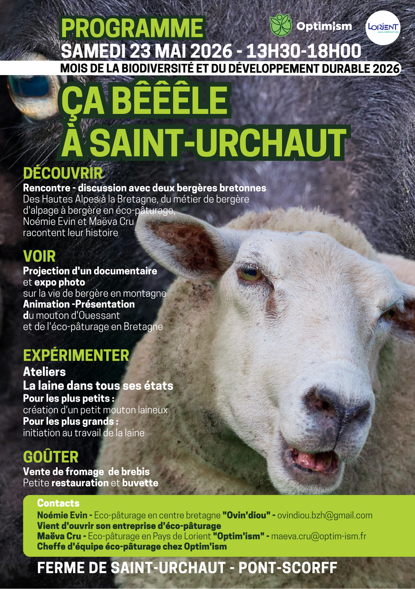 L’après-midi, à partir de 13 h 30 et jusqu’à à 18 h, place aux moutons à la ferme de Saint-Urchaut à Pont Scorff ! Des bergères d’alpage et d’éco-pâturage vous feront découvrir leur métier et les soins apportés aux animaux. Vous découvrirez l’activité d’éco-pâturage d’Optim’ism avec son troupeau de 190 moutons et chèvres disséminés sur le territoire du Pays de Lorient pour un entretien écologique des espaces verts ou du patrimoine naturel. Vous aurez aussi le plaisir de voir gambader les 29 petits agneaux nés cette année.