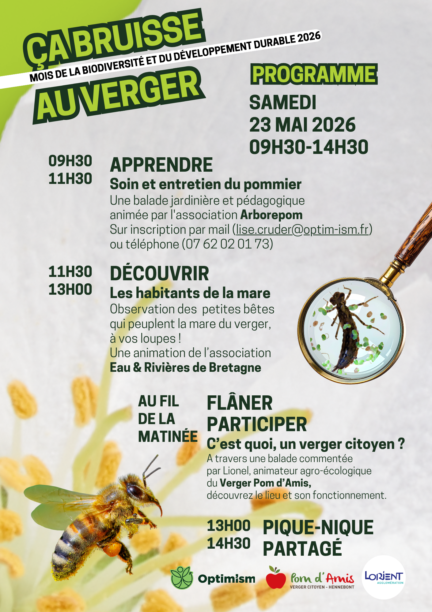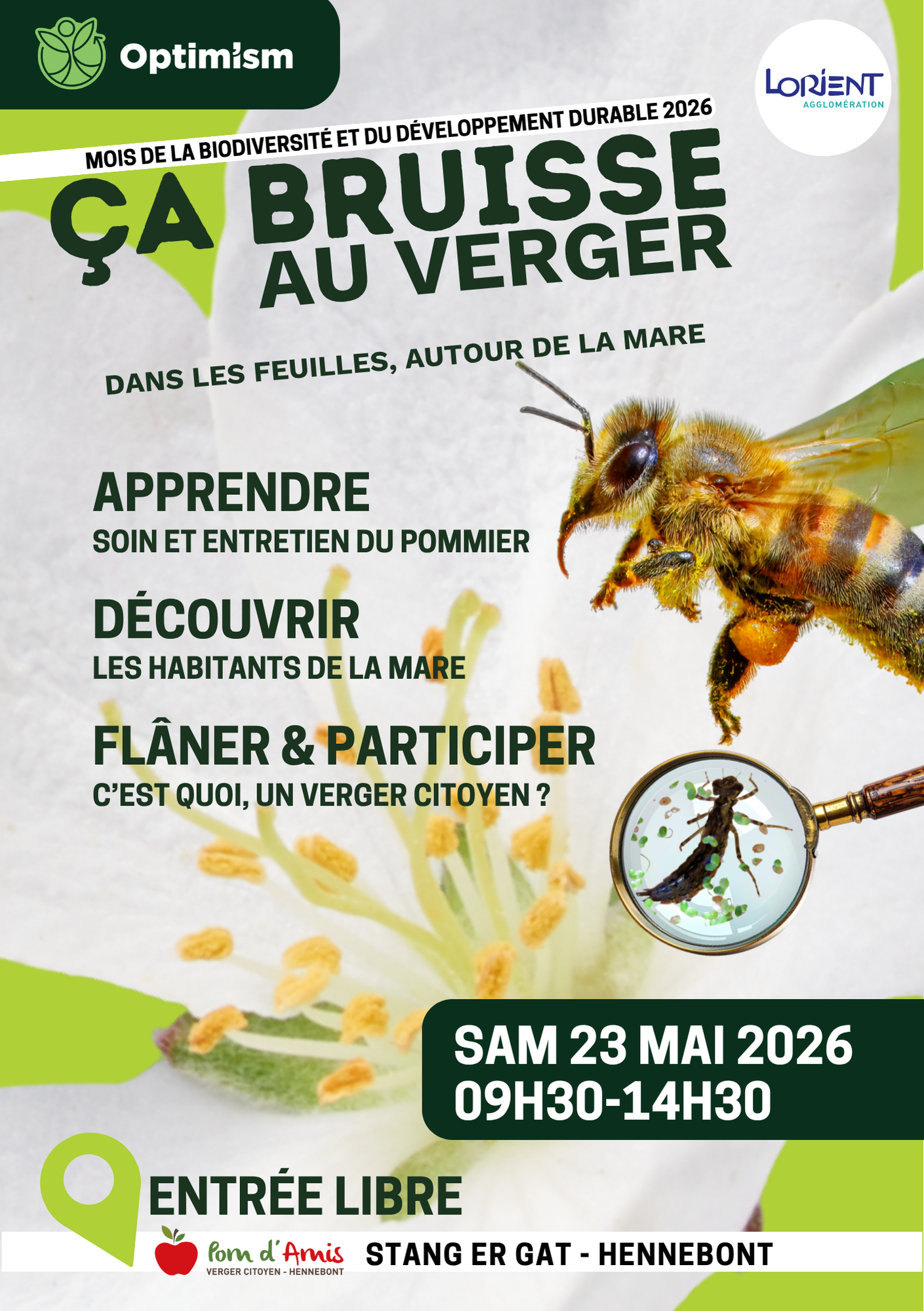 Ca bruisse au Verger, ça bêêêle à Saint-Urchaud : dans le cadre des animations du Mois de la biodiversité et du développement durable 2026, soutenues par Lorient Agglomération, Optim’ism organise deux temps forts le samedi 23 mai. Le public pourra, à travers différentes animations de sensibilisation, découvrir et échanger des connaissances sur la biodiversité locale.