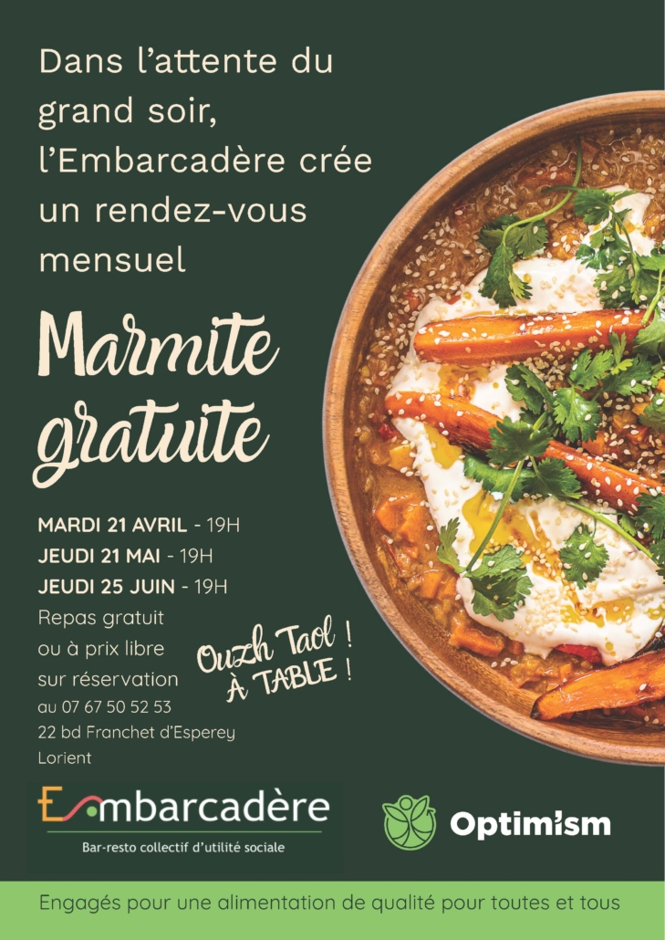 L’Embarcadère a franchi une nouvelle étape, le 1er janvier 2026, en devenant une Société coopérative d’intérêt collectif (Scic pour les intimes). Dans ce cadre, des repas gratuits ou à prix libres seront proposés tous les mois. Ce sont les « Marmites gratuites » avec une cagnotte participative au marché de légumes. Le premier est programmé le mardi 21 avril 2026 à 19 h, sur réservation à L’embarcadère Lorient au 07.67.50.52.53. A table !