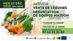 Une fois n'est pas coutume, notre ferme de Moëlan-sur-Mer, plutôt tournée vers la restauration collective, ouvre en grand ses portes au public le mercredi 10 décembre 2025, de 12 h à 16 h 30. Vous pourrez y acheter des légumes et déguster des soupes maison. Avec Ty Pote au Feu, dans la matinée, vous pourrez cuisiner sur place votre soupe avec les invendus de la ferme, de 10 h à 12 h. L'atelier est gratuit sur inscription (5 personnes maximum).…