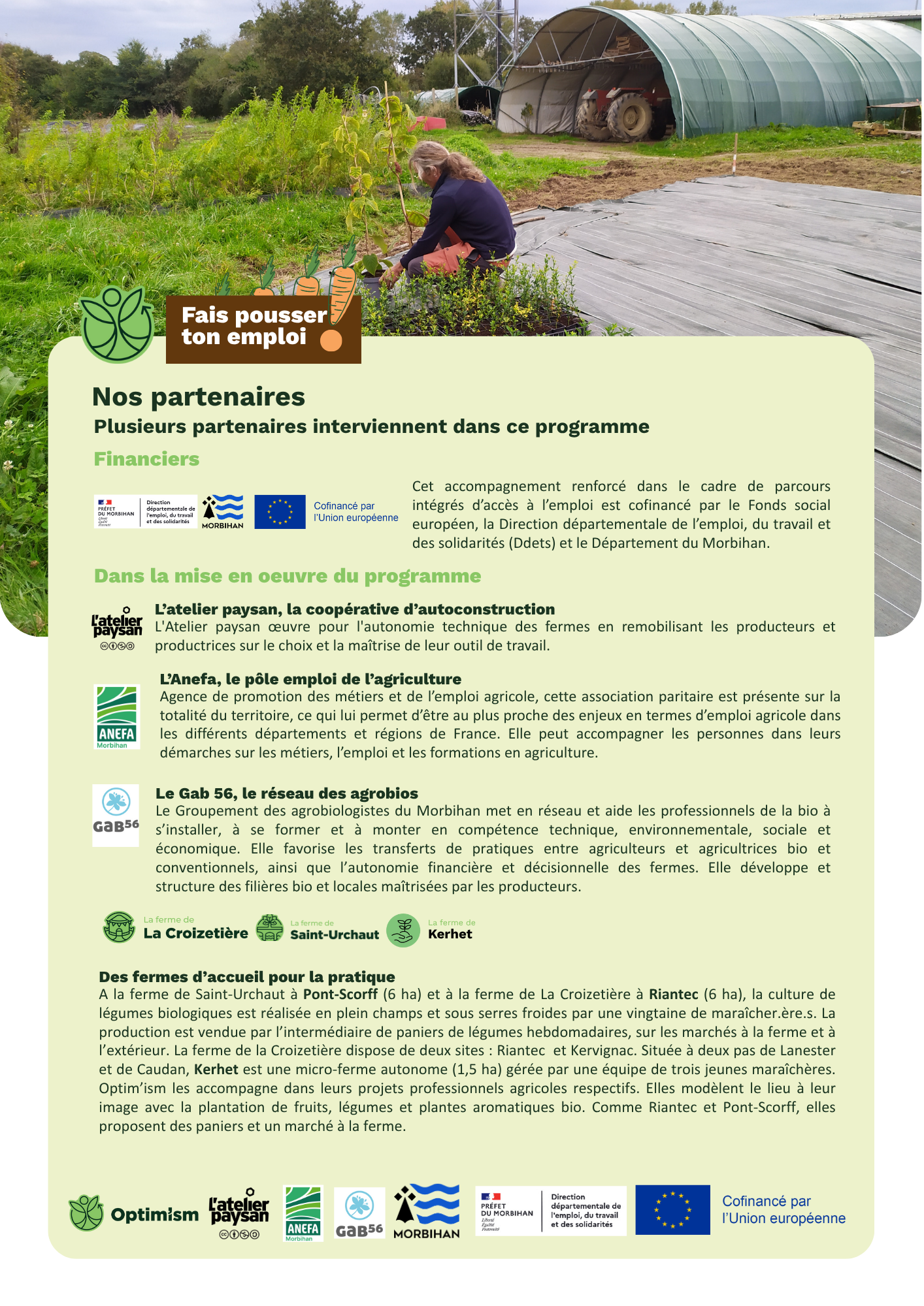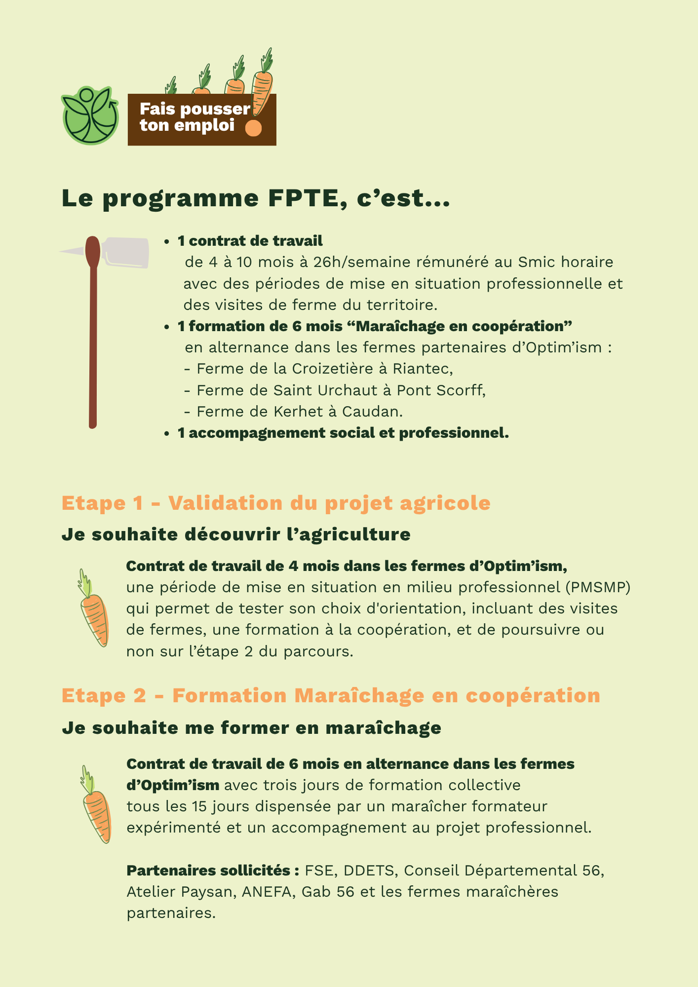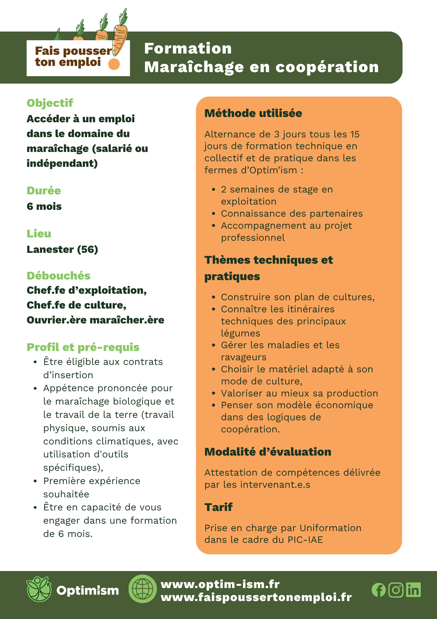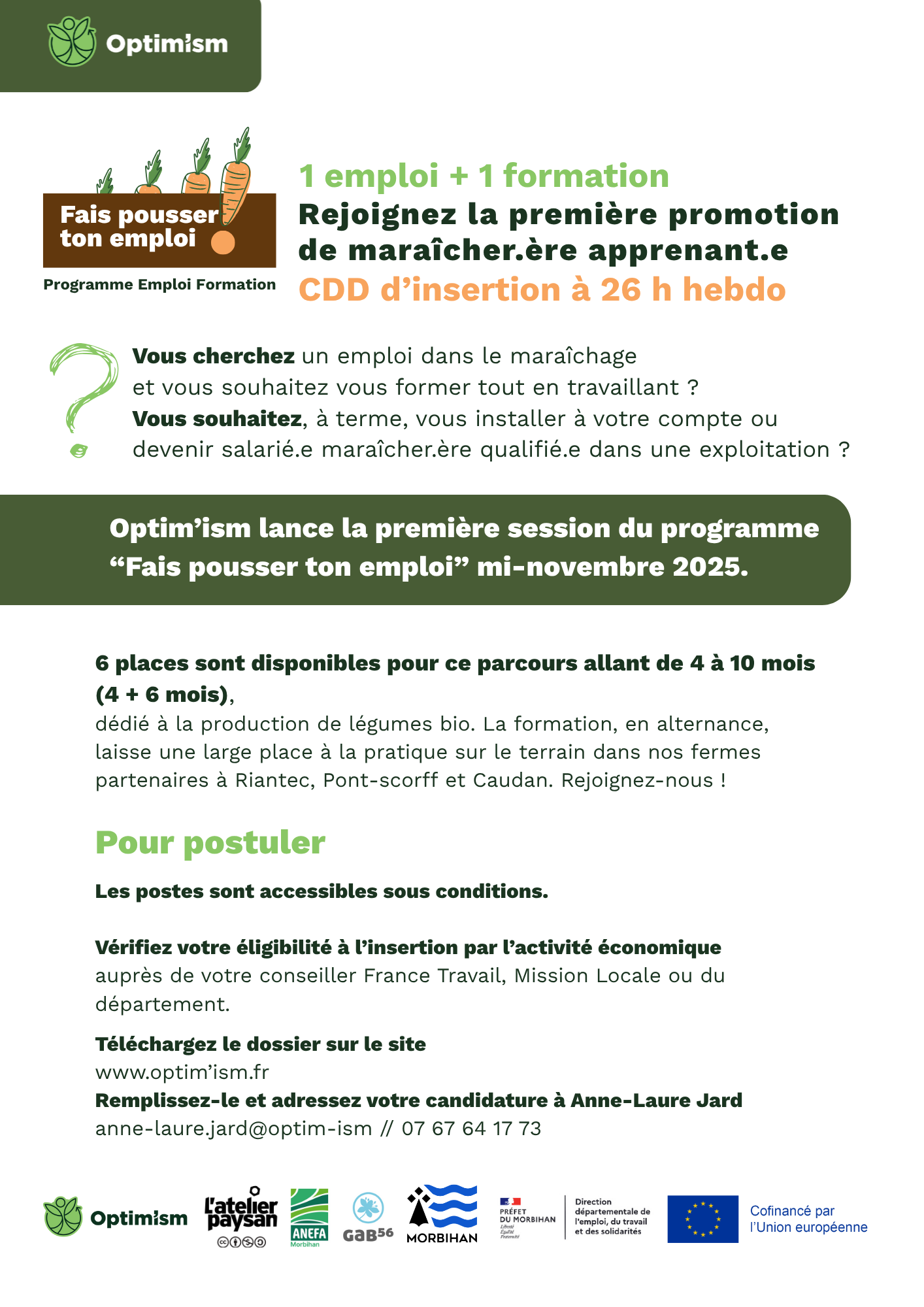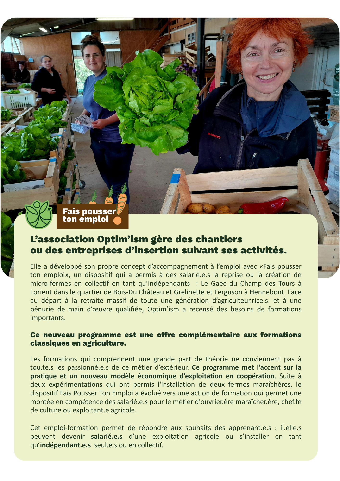 Elle a développé son propre concept d’accompagnement à l’emploi avec «Fais pousser ton emploi», un dispositif qui a permis à des salarié.e.s la reprise ou la création de micro-fermes en collectif en tant qu’indépendants : Le Gaec du Champ des Tours à Lorient dans le quartier de Bois-Du Château et Grelinette et Ferguson à Hennebont. Face au départ à la retraite massif de toute une génération d’agriculteur.rice.s. et à une pénurie de main d’œuvre qualifiée, Optim’ism a recensé des besoins de formations importants.