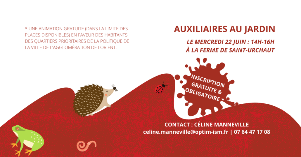Les bêtes ne sont pas toujours les bienvenues dans nos potagers, pourtant toutes ont leur place et leur rôle à jouer dans l'écosystème. RDV le mercredi 22 juin 2022 de 14H à 16H à la ferme de Saint-Urchaut (Pont-Scorff). Du covoiturage peut être envisagé. Une animation gratuite (dans la limite des places disponibles) à destination des habitant·e·s des quartiers prioritaires de la politique de la ville de l’agglomération de Lorient pour s’informer, se former, découvrir des pratiques durables et rencontrer…